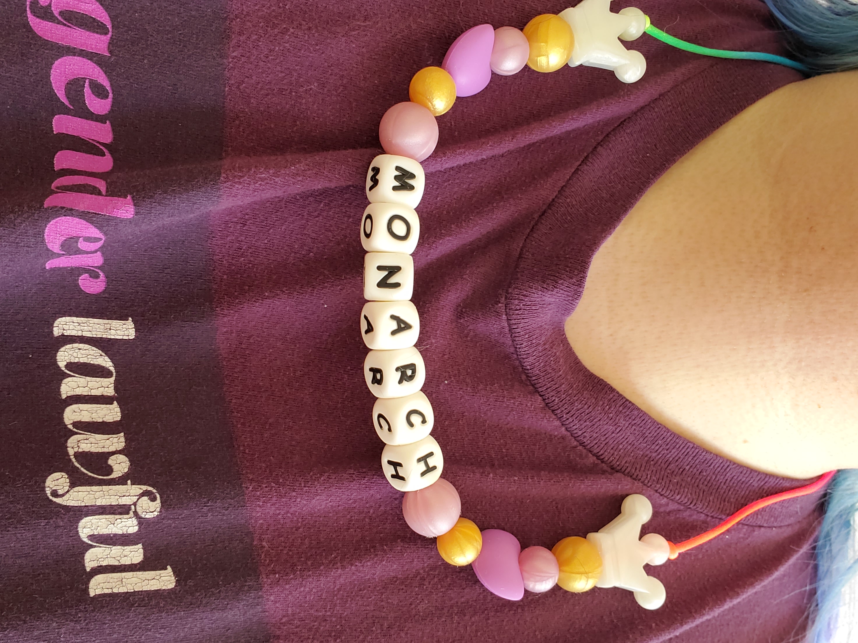 Monarch: The 15mm round beads closest to the word MONARCH are metallic lilac, the 12mm round beads after them are metallic gold, the hearts are lavender, the 12mm round beads after the hearts are metallic lilac, and the last 15mm round beads are metallic gold. The three pointed crowns are pearl white.