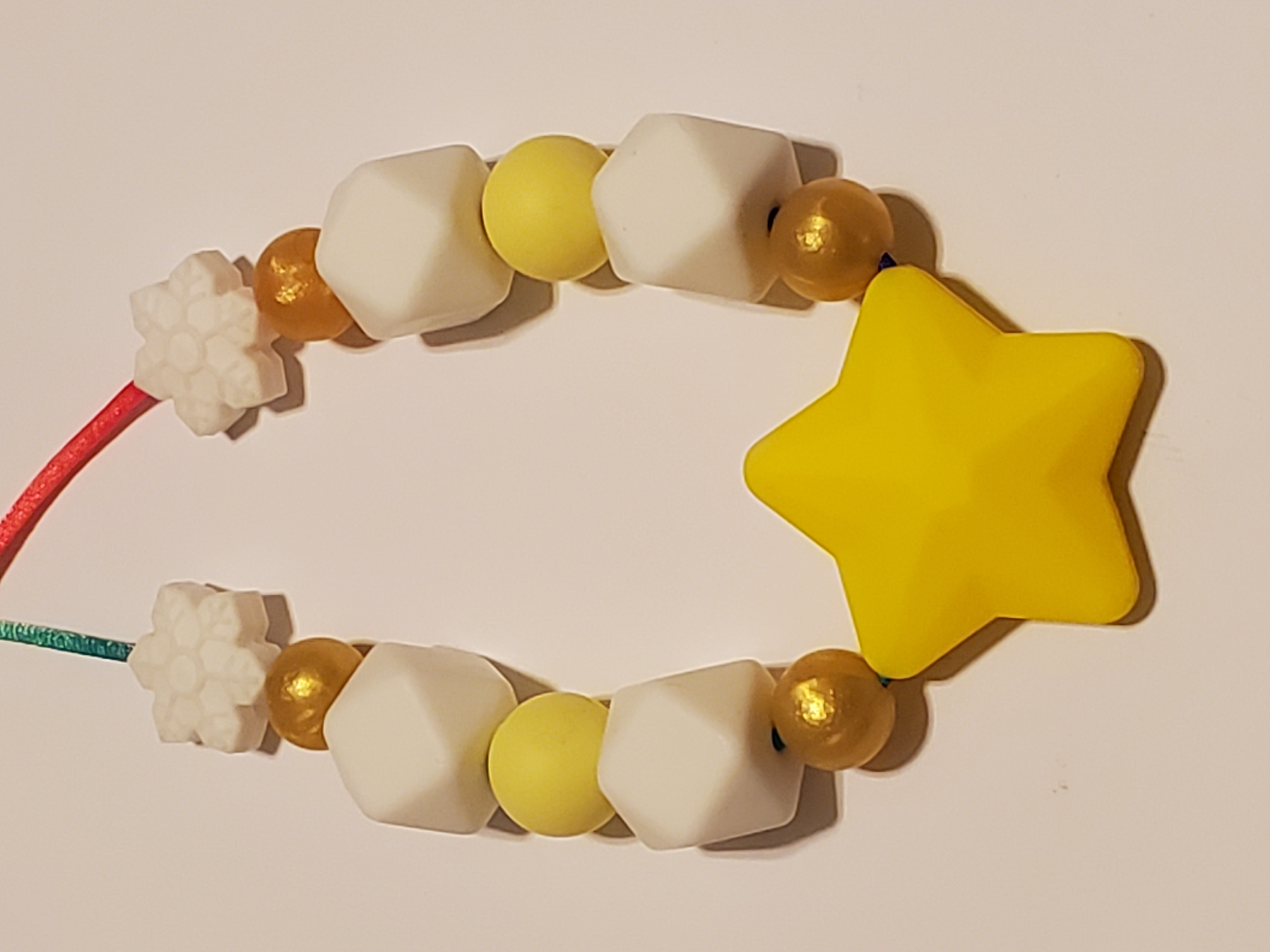 Gold- Yellow central star, metallic gold 12mm round bead, white hexagon bead, pale yellow 14mm round bead, white hexagon bead, metallic gold 12mm round bead, white snowflake.