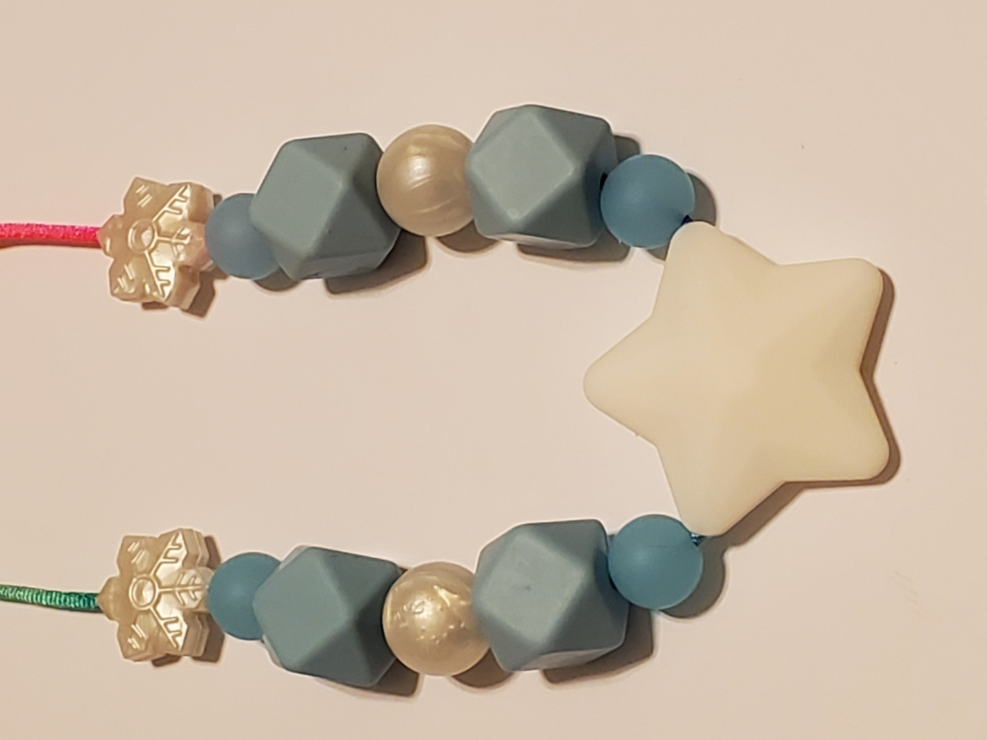 Blue- Dark blue central star, metallic silver 12mm round bead, pale gray hexagon bead, periwinkle blue 14mm round bead, pale gray hexagon bead, metallic silver 12mm round bead, pale blue snowflake.