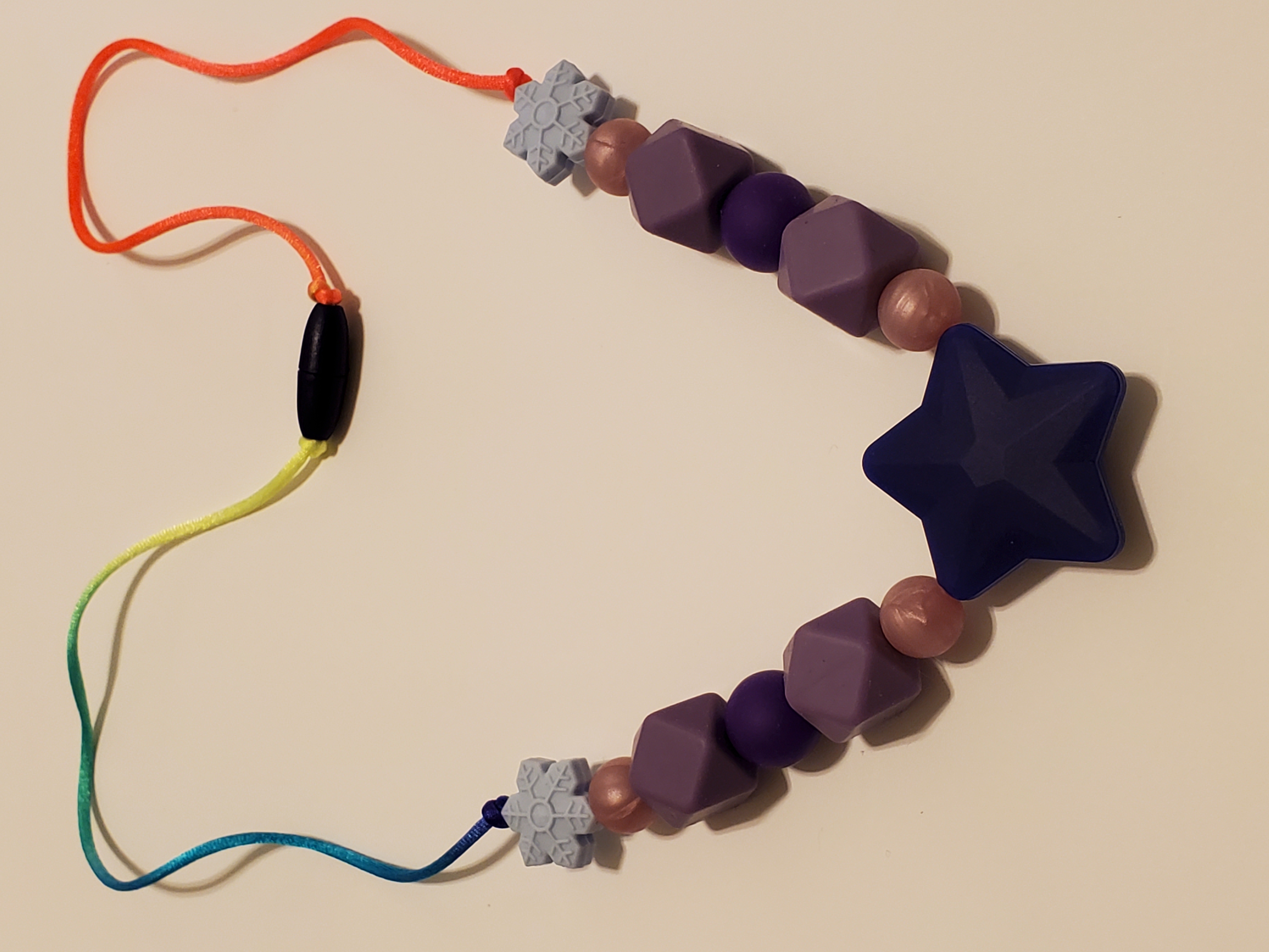 There are 9 variants for this necklace. They all have beads in the same pattern of shapes, but the colors of the beads are slightly different between them. Each necklace has a central 1.5" star pendant with a matching pattern of beads on each side. First a 12mm round bead, then 2 "hexagon" beads (which have 6 quadrilateral facets and 8 slightly smaller triangular facets) with a 14mm round bead in between them, next another 12mm round bead, and finally a 14mm snowflake bead.