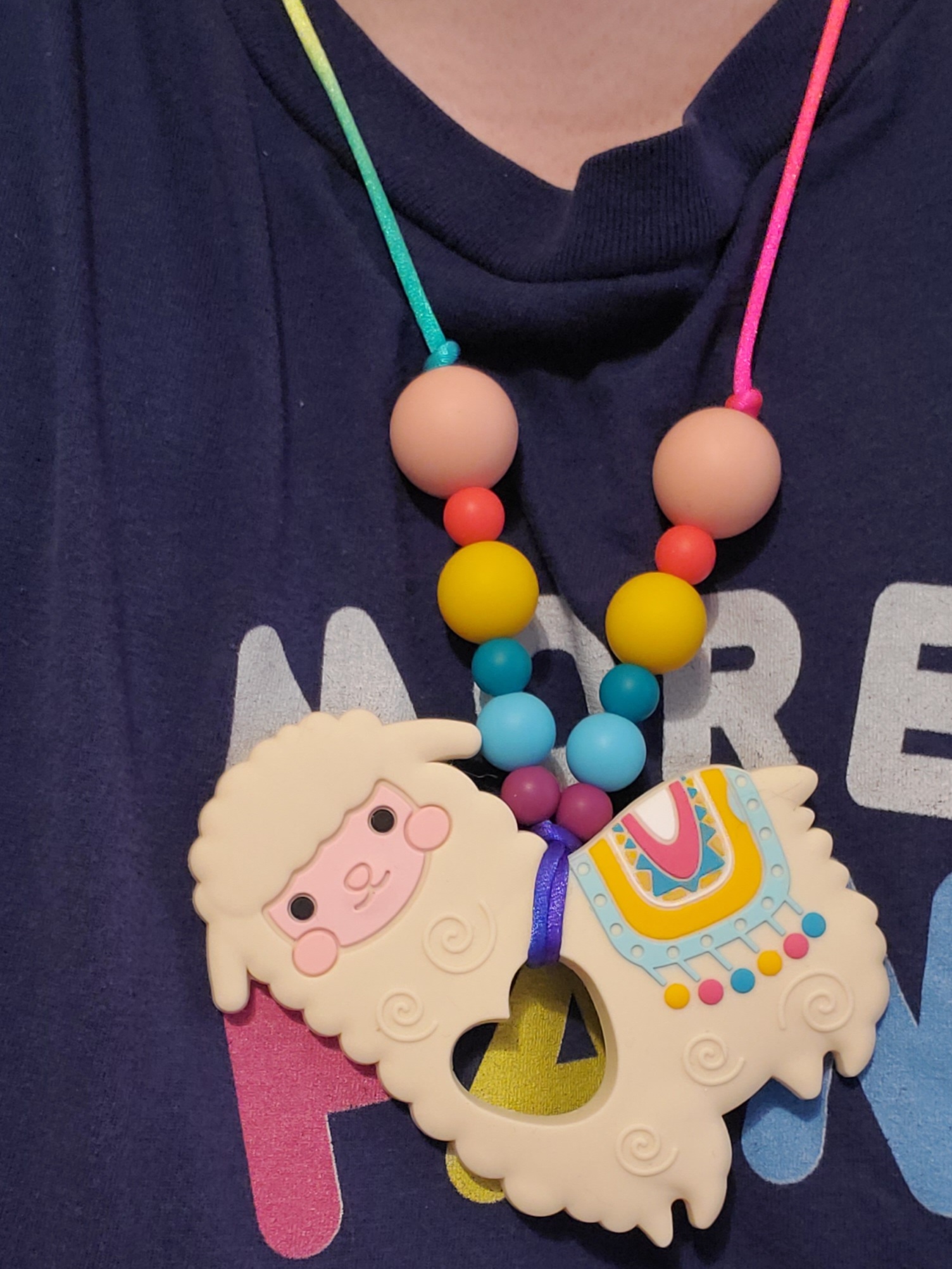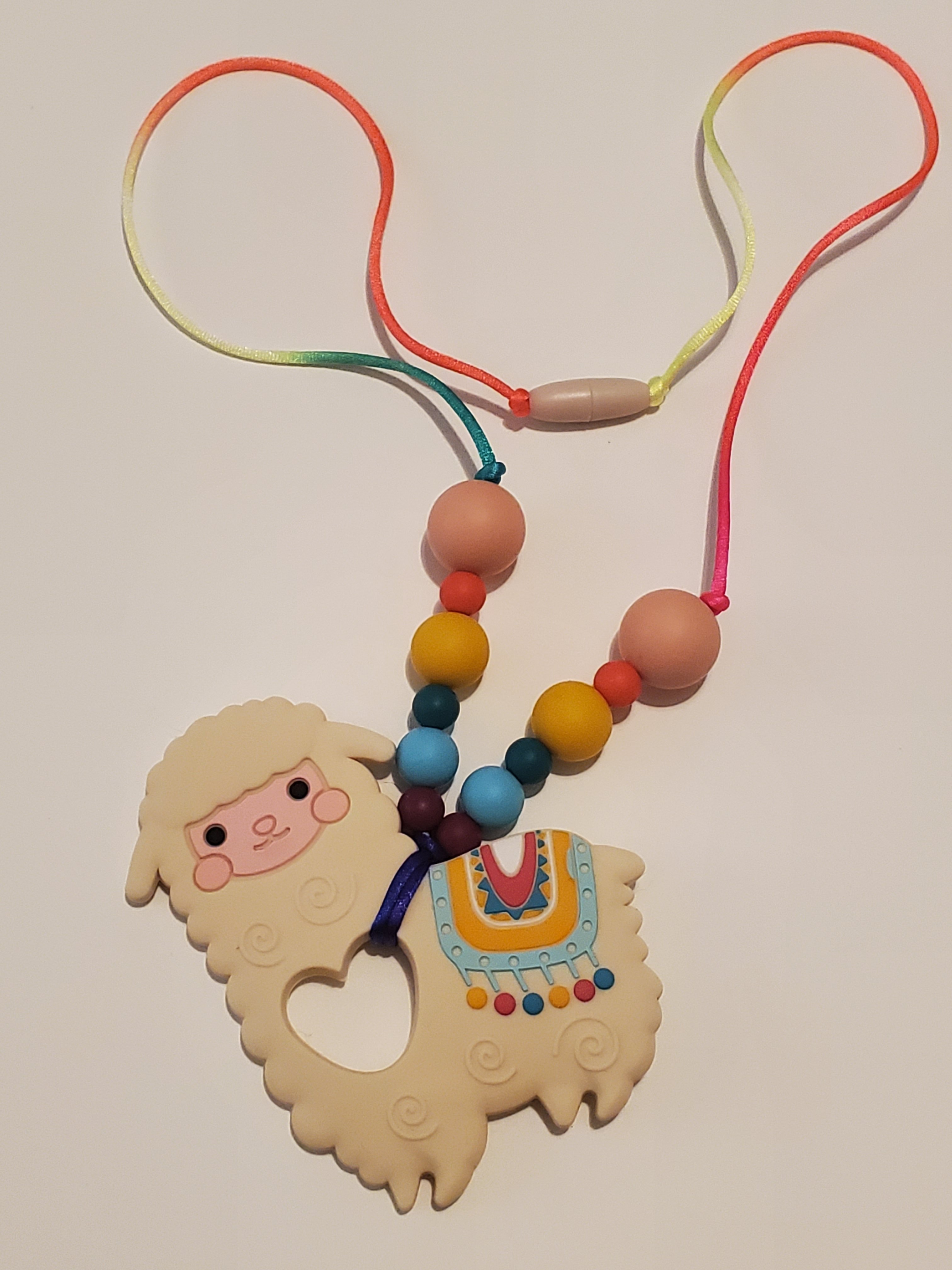 The central pendant is an off-white llama with a pink face and cheeks wearing a pink, yellow, white, teal, and light blue South American style blanket over its back.