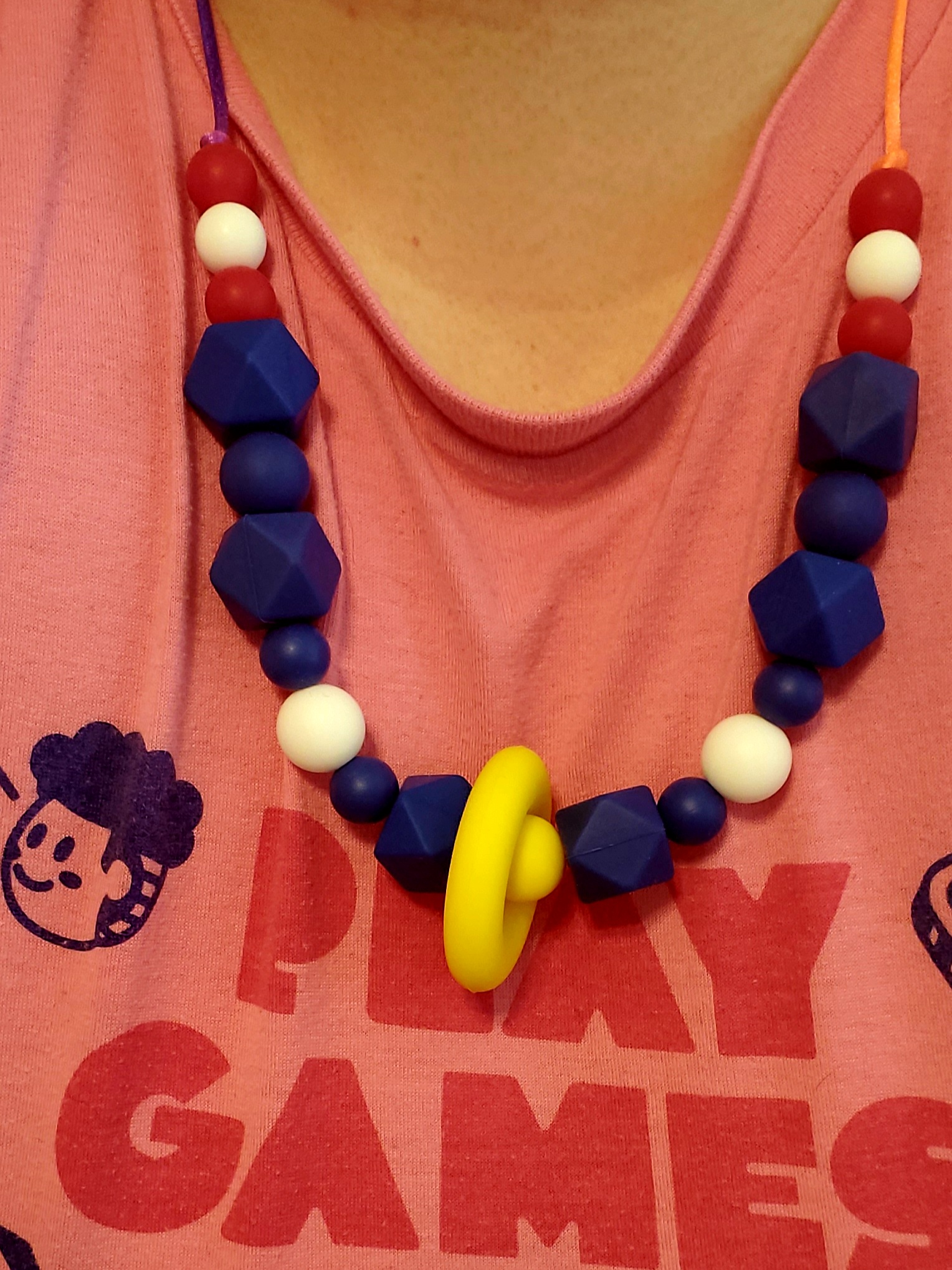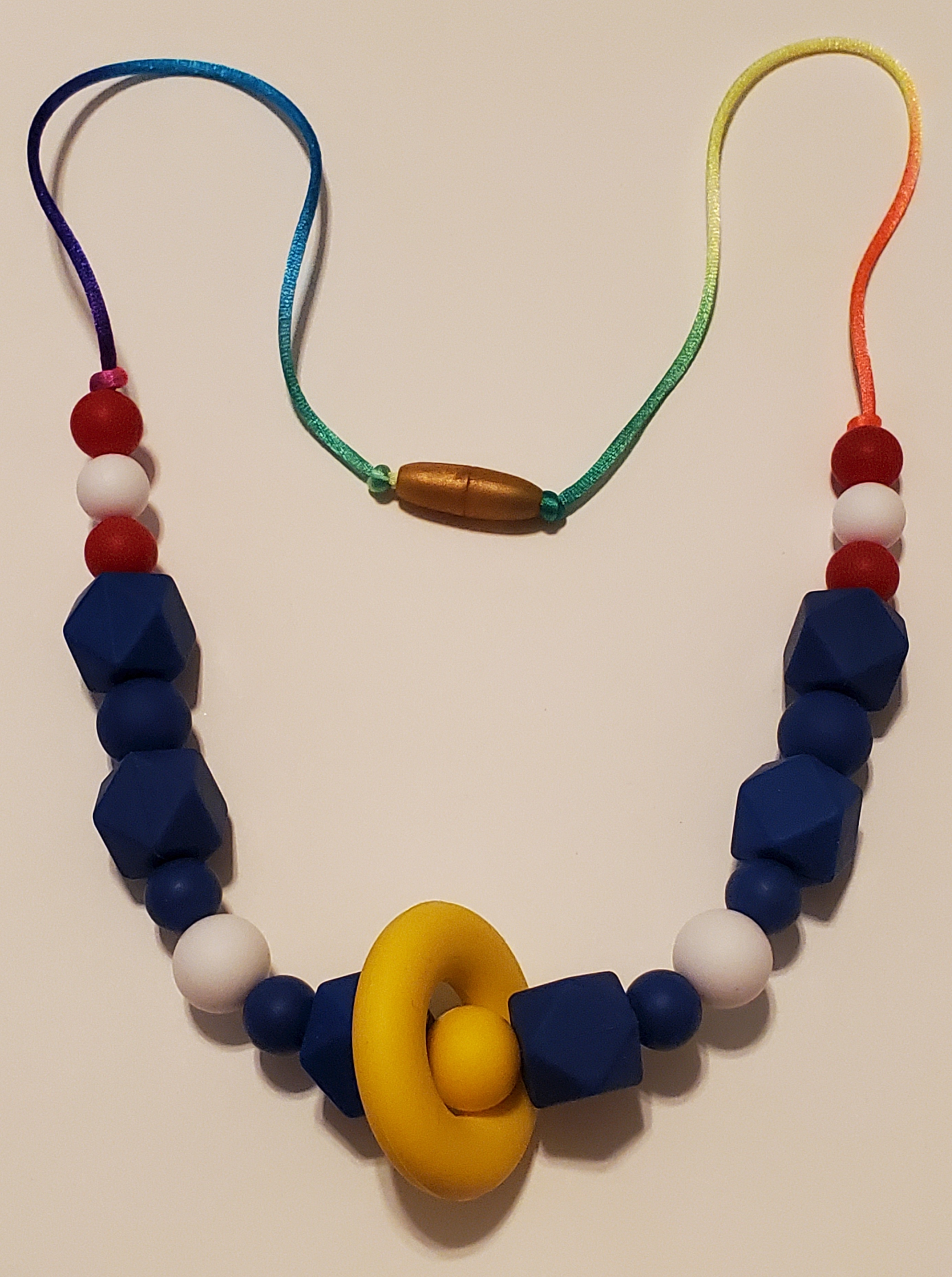 A necklace of silicone beads on a rainbow satin/nylon cord. The necklace is themed after Sonic the hedgehog.