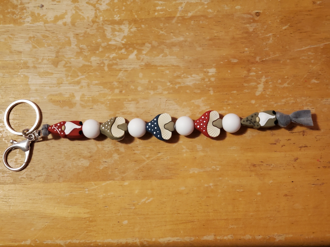 A keychain with gnomes and mushrooms on it. It has a standard keyring as well as a little claw clip for attaching it to keys. The top bead is a little gnome with a white beard wearing a red robe and a matching red hat with white stars on it. The next 7 beads are 4 white 15mm round beads alternating with 3 mushroom beads in grayish brown, blue, and red. All the mushrooms have little white spots on top, beige undersides, and grayish brown stems. The last bead is another little gnome with a white beard. This time he has a grayish brown robe and a matching hat with slightly darker brown stars on it. The beads are strung on gray jersey fabric "yarn".