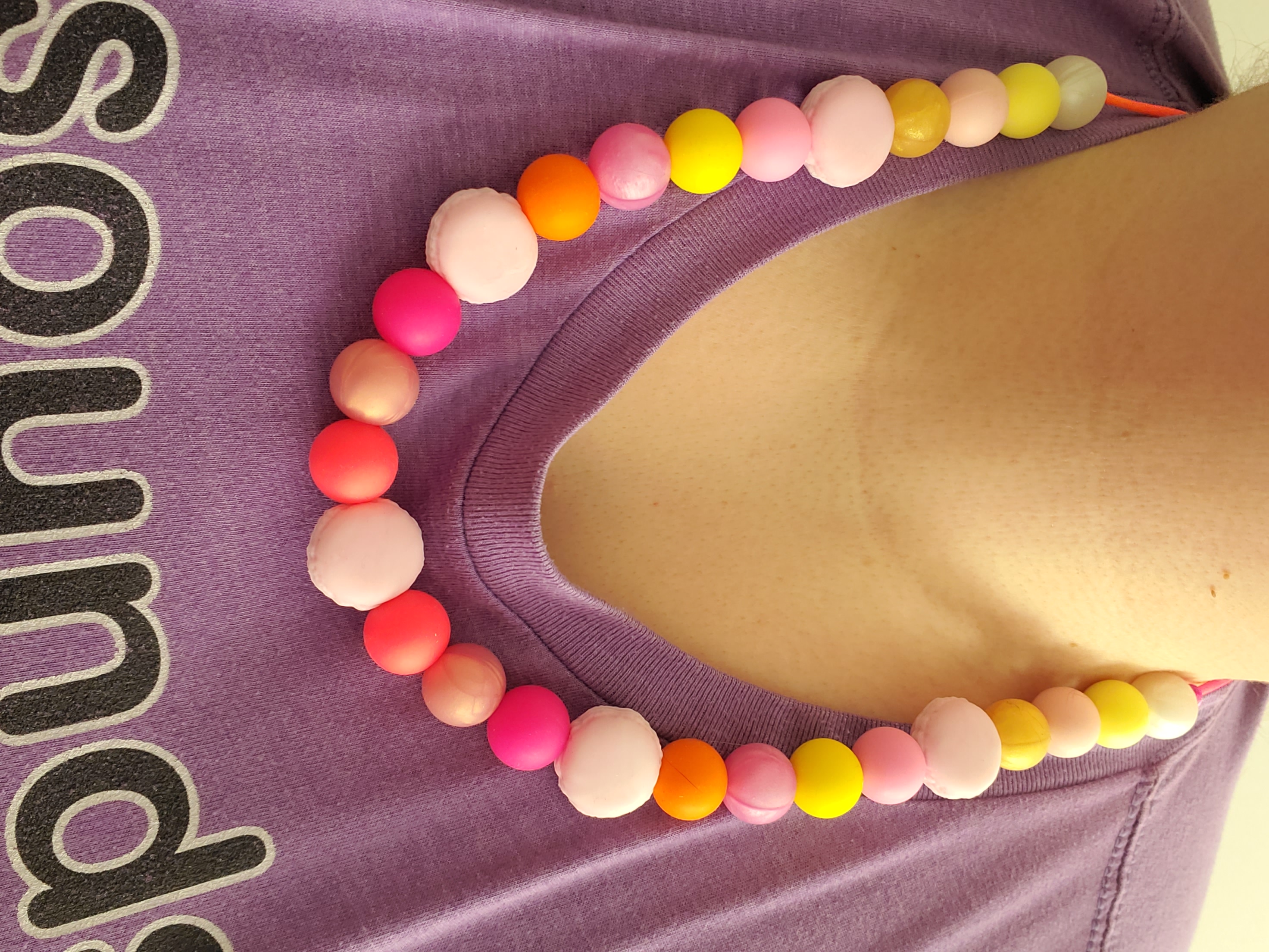 There are 6 sections of 12mm round beads each separated from the other by a 14mm macaron bead that's light pink with white swirls in it. The outer two sections are 4 beads, pearl white, butter yellow, pale pink, and metallic gold. The next two sections are cotton candy pink, sunshine yellow, metallic pink, and orange. The inner two sections are magenta, metallic rose gold, and neon pink.