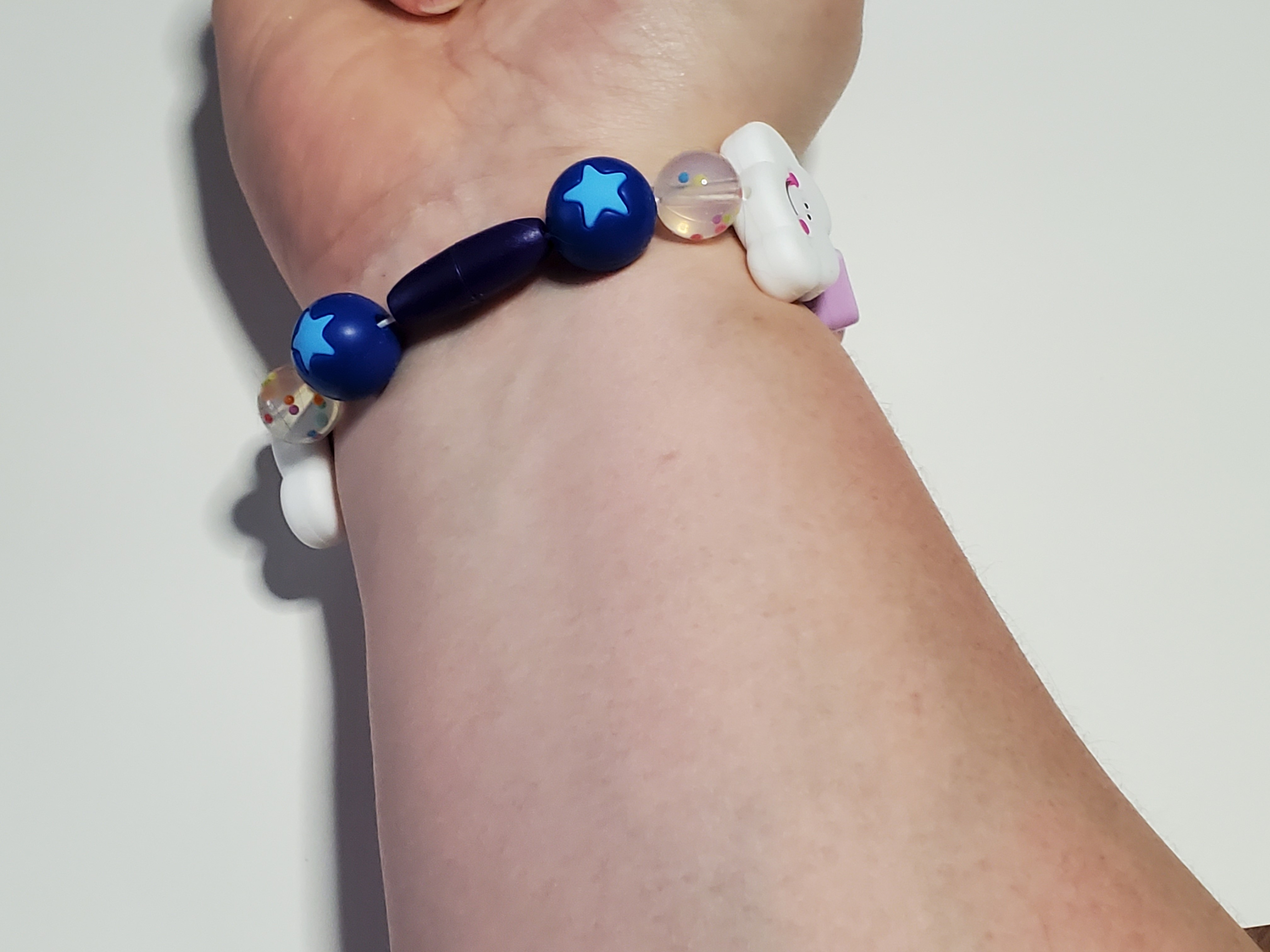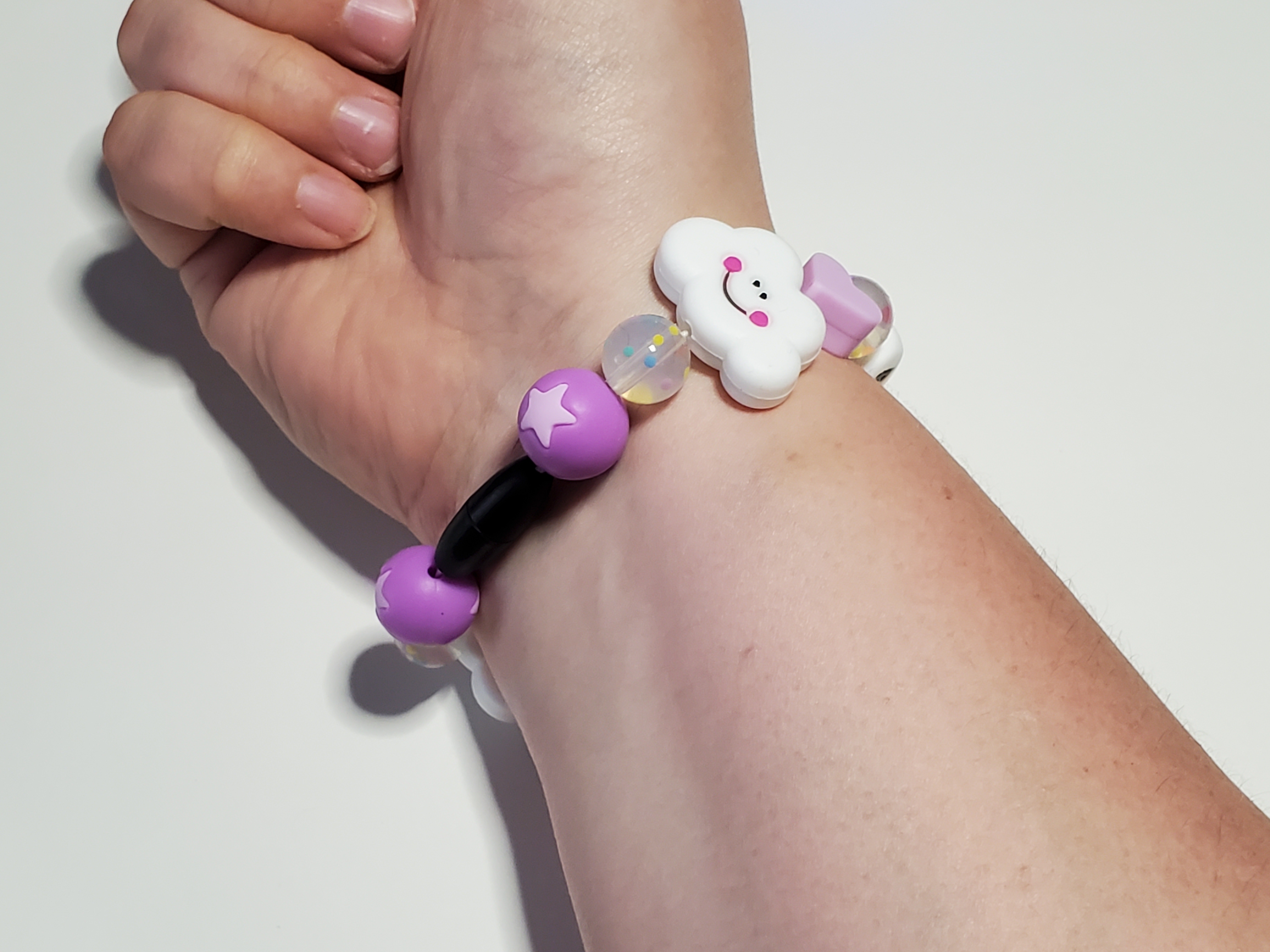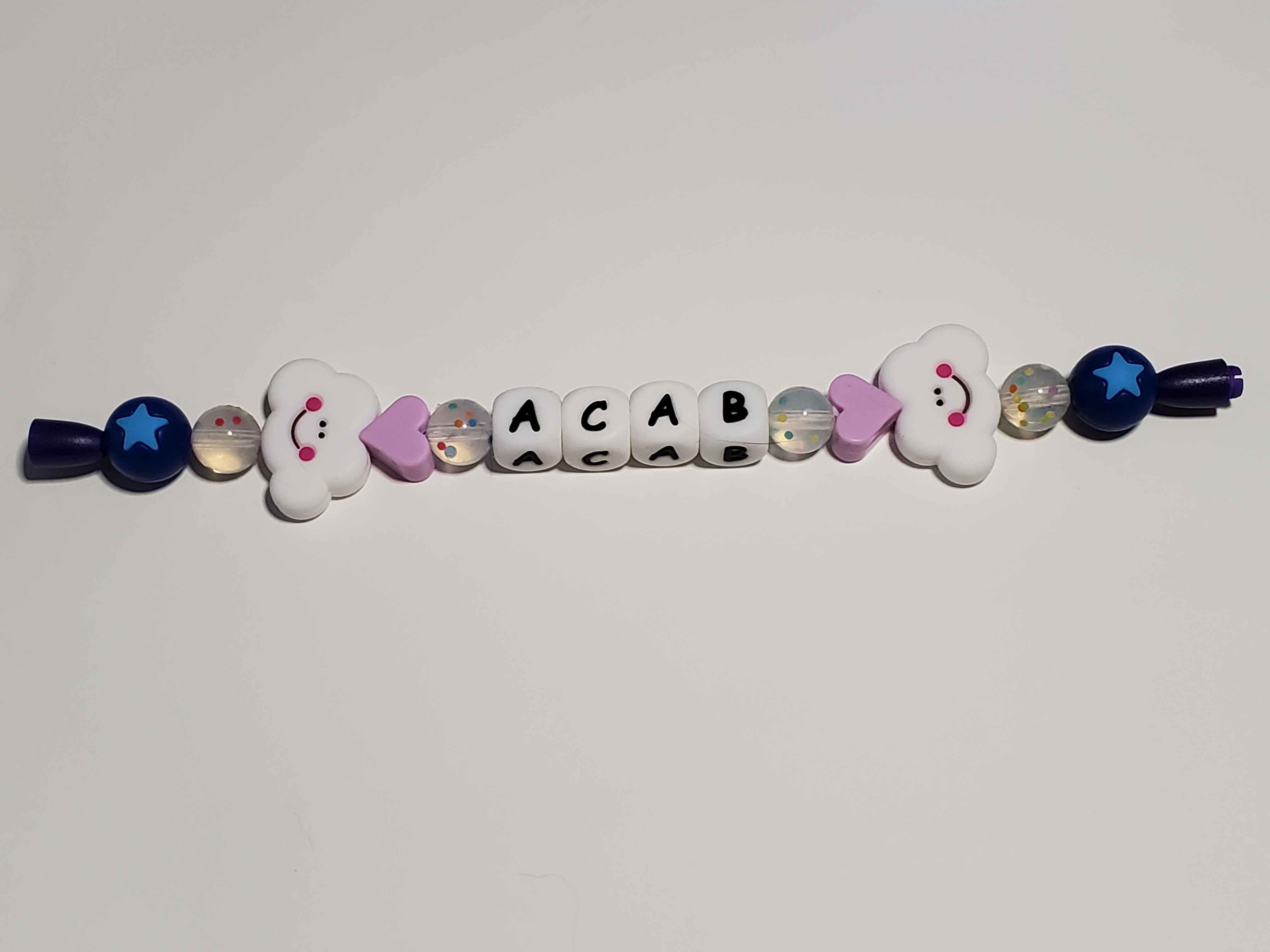 At the center of this bracelet are four 14mm white cube beads with letters on them that spell out ACAB. On either side of these beads is a matching pattern of decorative beads. Closest to the lettered beads is a 12mm clear round bead with rainbow specks in it. Next is a 13mm lilac heart bead followed by a 20mm white cloud bead with a smiling face on it. The last two beads are another 12mm clear round bead with rainbow specks followed by a 14mm round bead a star in its center. The color of the star and bead differs between variants. On the pink bracelet it's a pale pink bead with a magenta star, the purple bracelet has a lavender bead with a pale lilac star, and the blue bracelet has a dark blue bead with a light blue star.