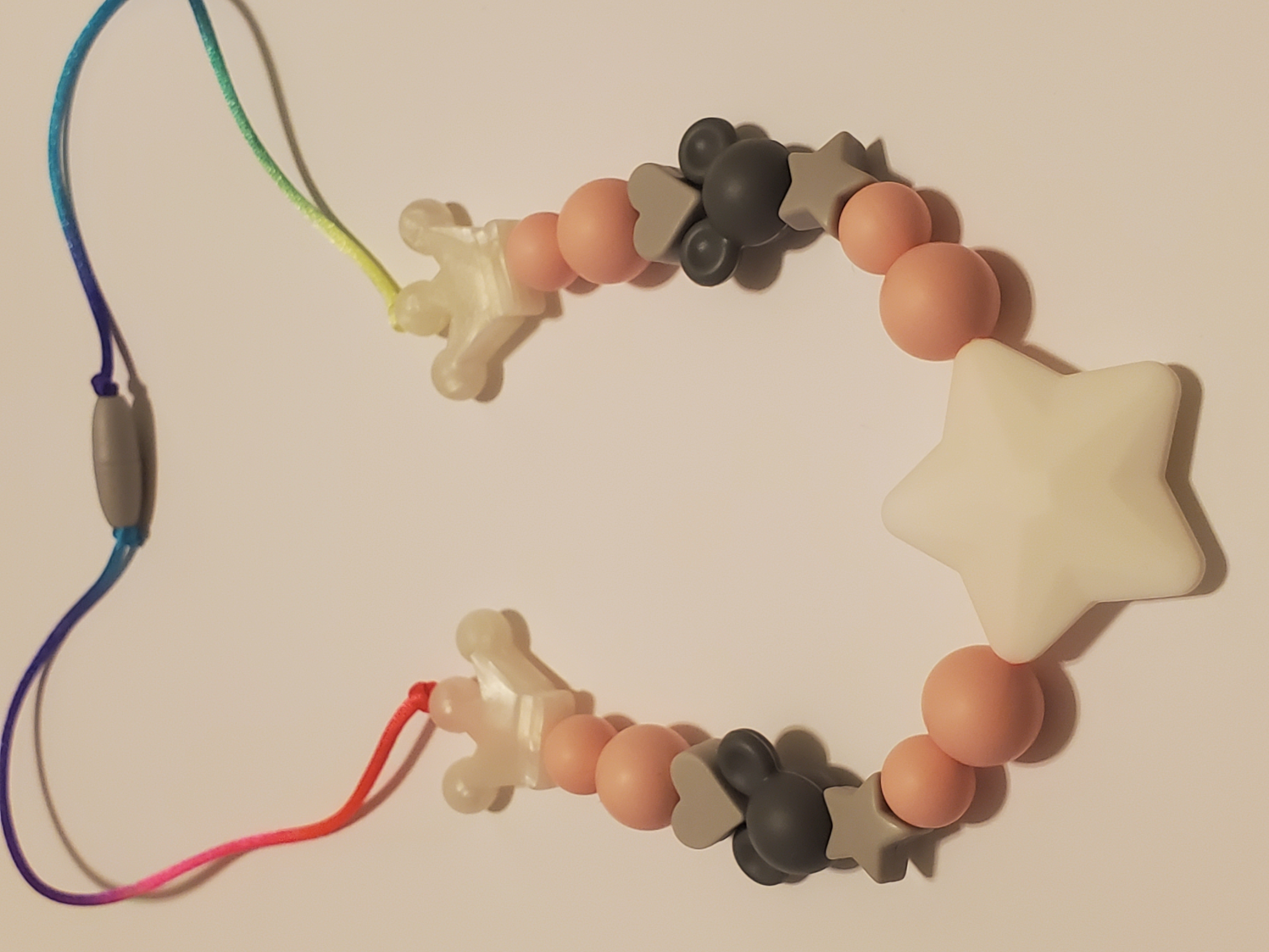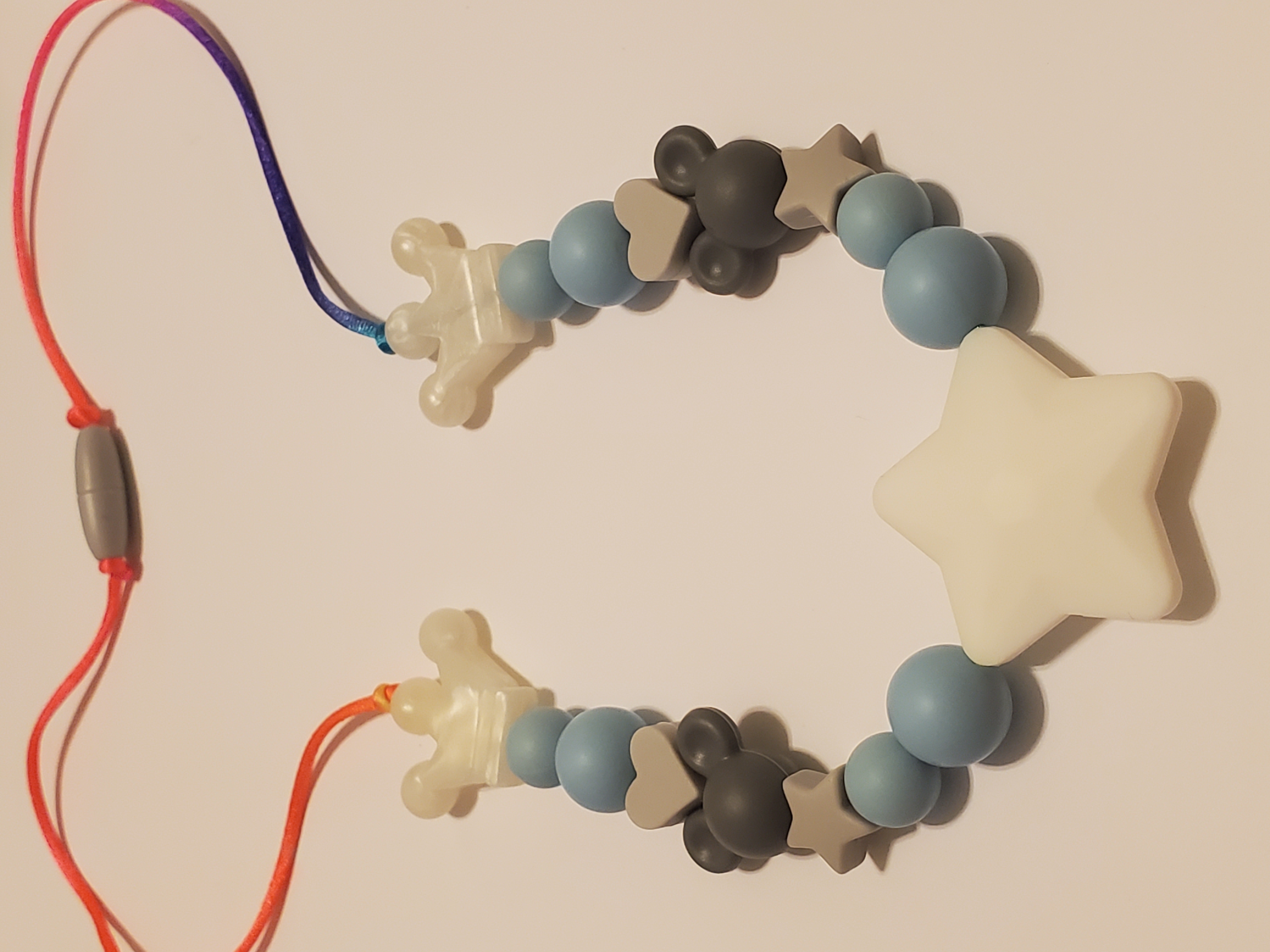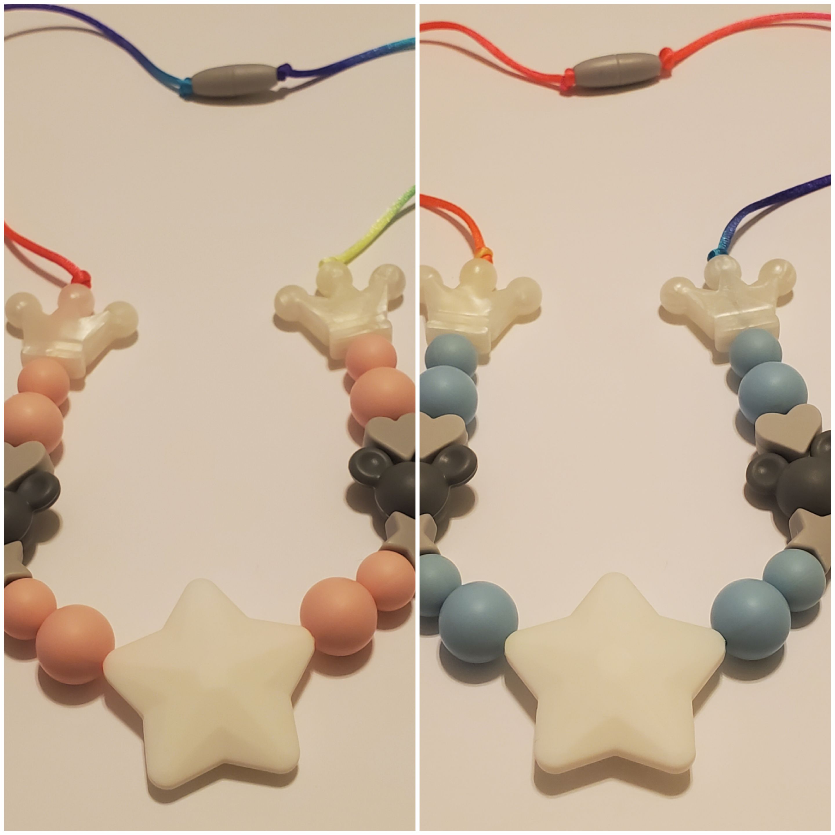 There is a 4cm (~1.5 inch) wide white star in the center of the necklace beads. The other beads are in a matching pattern on either side of the central star. Closest to the star are 2 round beads (one 15mm and one 12mm) followed by a The next three beads in the pattern are a 14mm gray heart bead. 15mm dark gray bead shaped like a certain famous mouse and a 14mm gray heart bead followed by two round beads (one 15mm and one 12mm). The last bead in the pattern is a pearl white three pointed crown.
