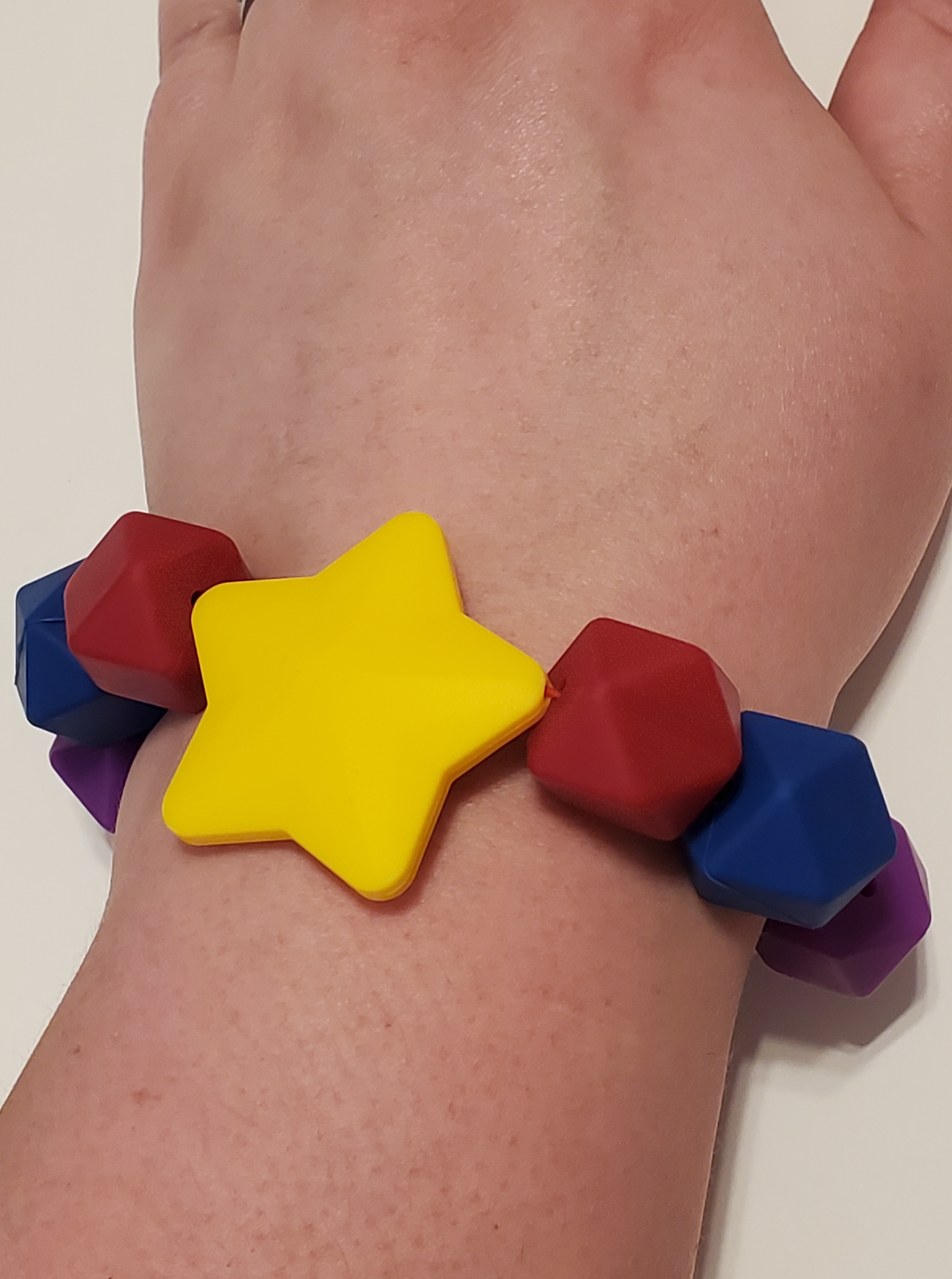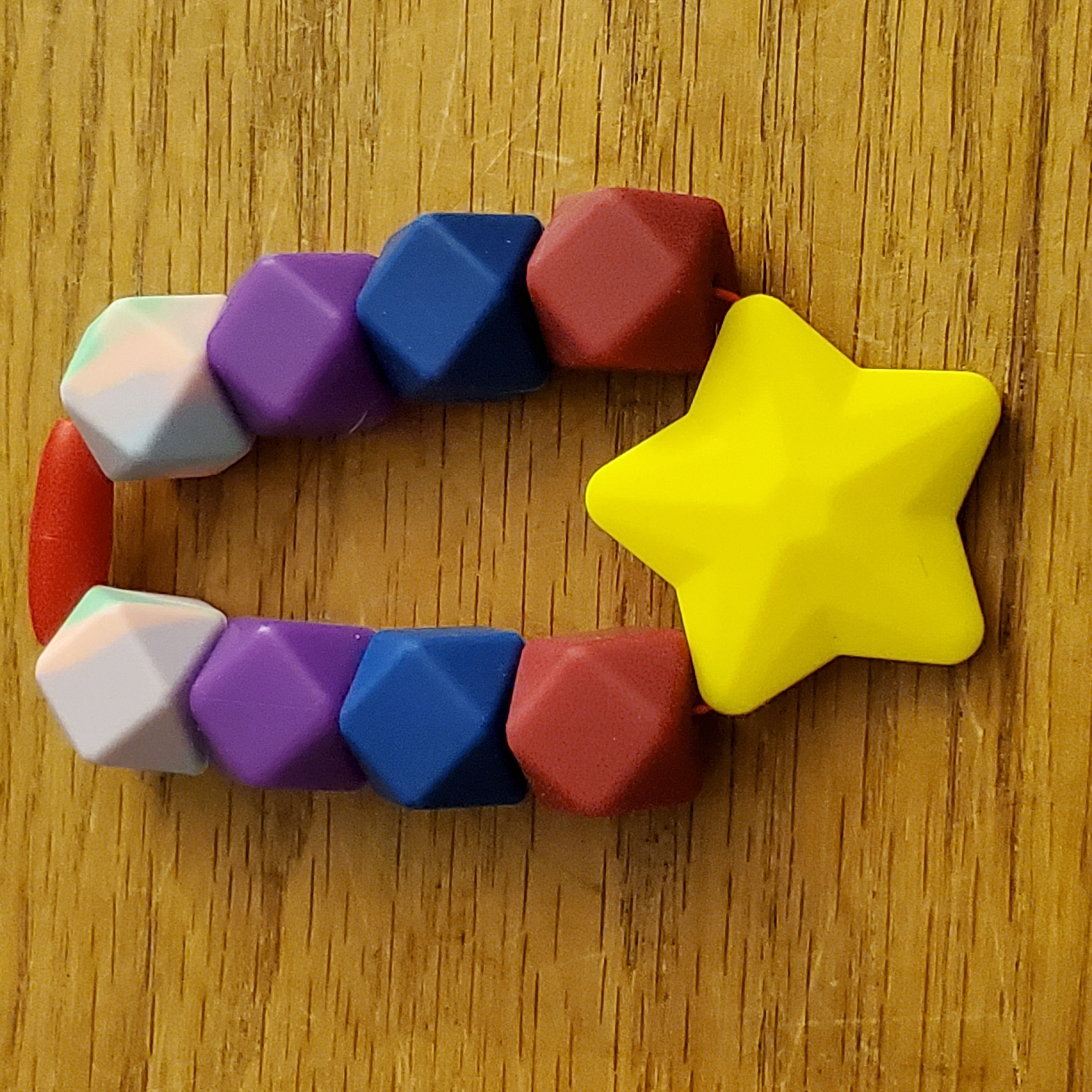 The center bead of this bracelet is a 1 inch yellow star. On either side of that star are matching patterns of 4 hexagon beads. From the star outward they are garnet red, sapphire blue, amethyst purple, and pastel tie dye. On the opposite side of the bracelet from the star is a red pop safety clasp.